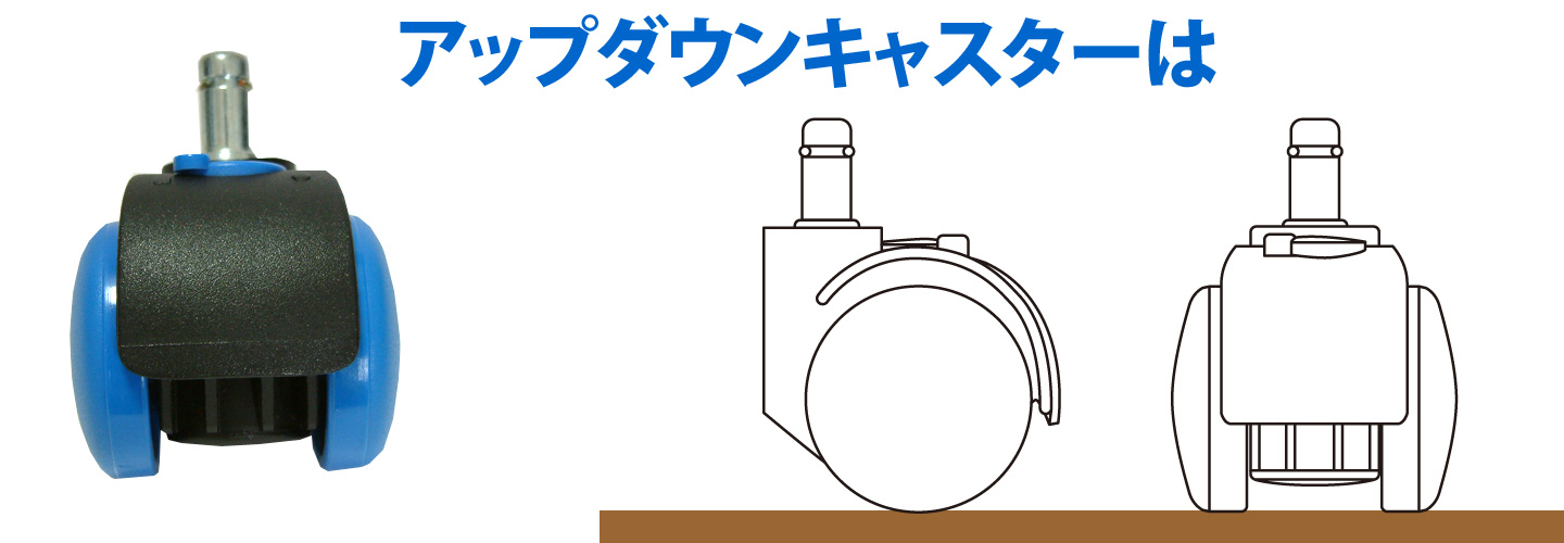 アップダウンキャスターは、荷重により車輪がアップし、床へダウン(接地)する、利便性が非常に高いキャスターです。
