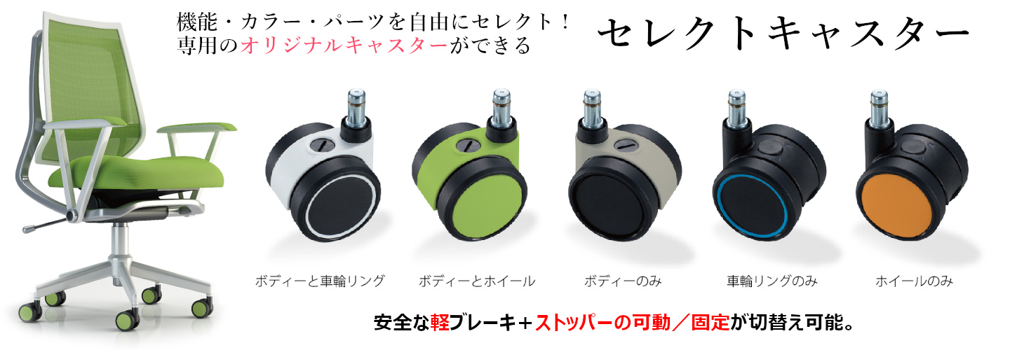 セレクトキャスターは、軽ブレーキ機能に加え、Wモーション機能を持つ高性能キャスターを、製品やインテリアに合わせて、独自にデザインコーディネートできる、次世代のキャスターです。
