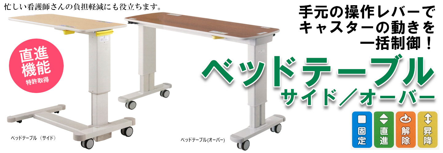 ベッドテーブルは、業界初の直進機能に加え、手元レバーで一括制御によるキャスターの固定/解除が可能な、医療・介護向けテーブルです。キャスターメーカーの視点から、新たに開発されました。